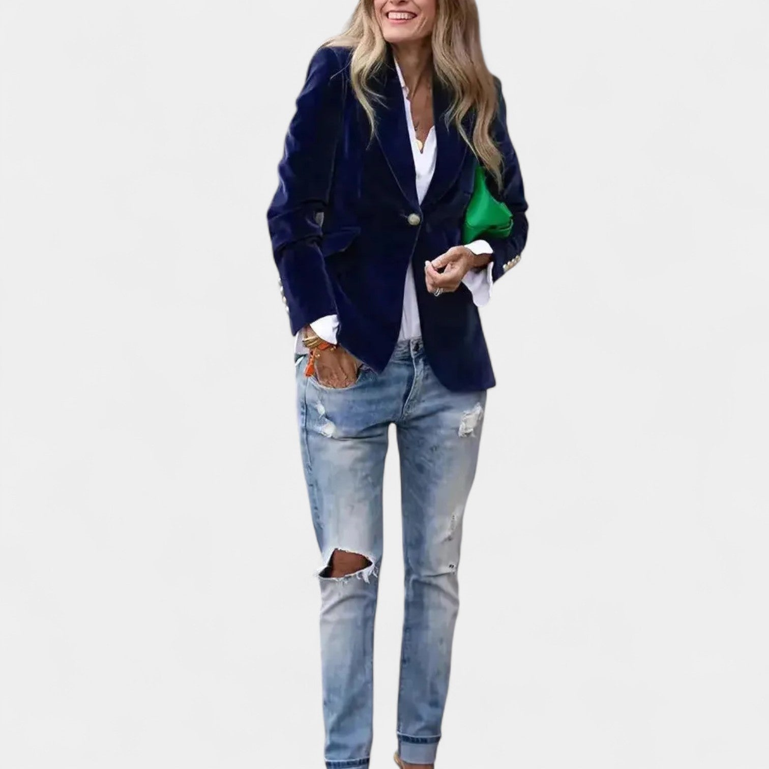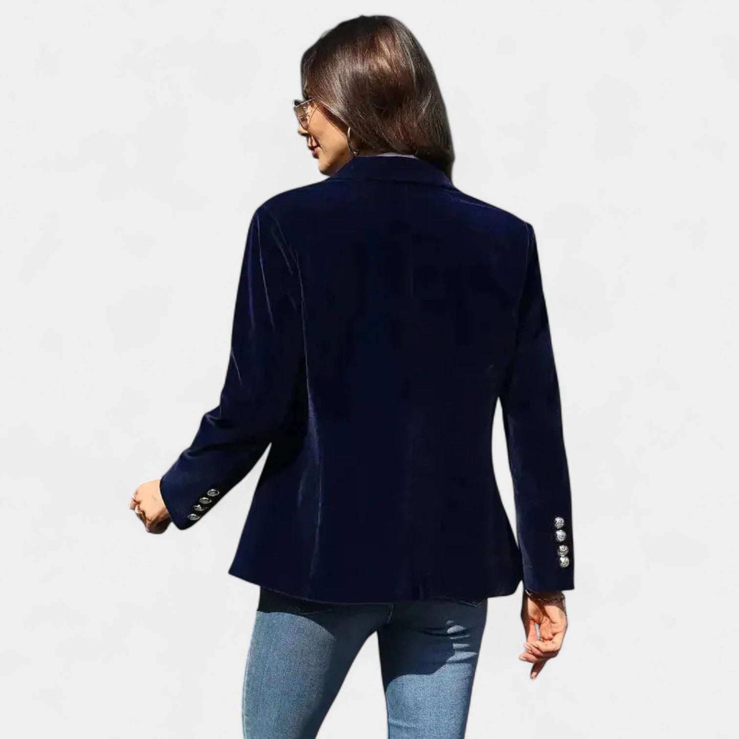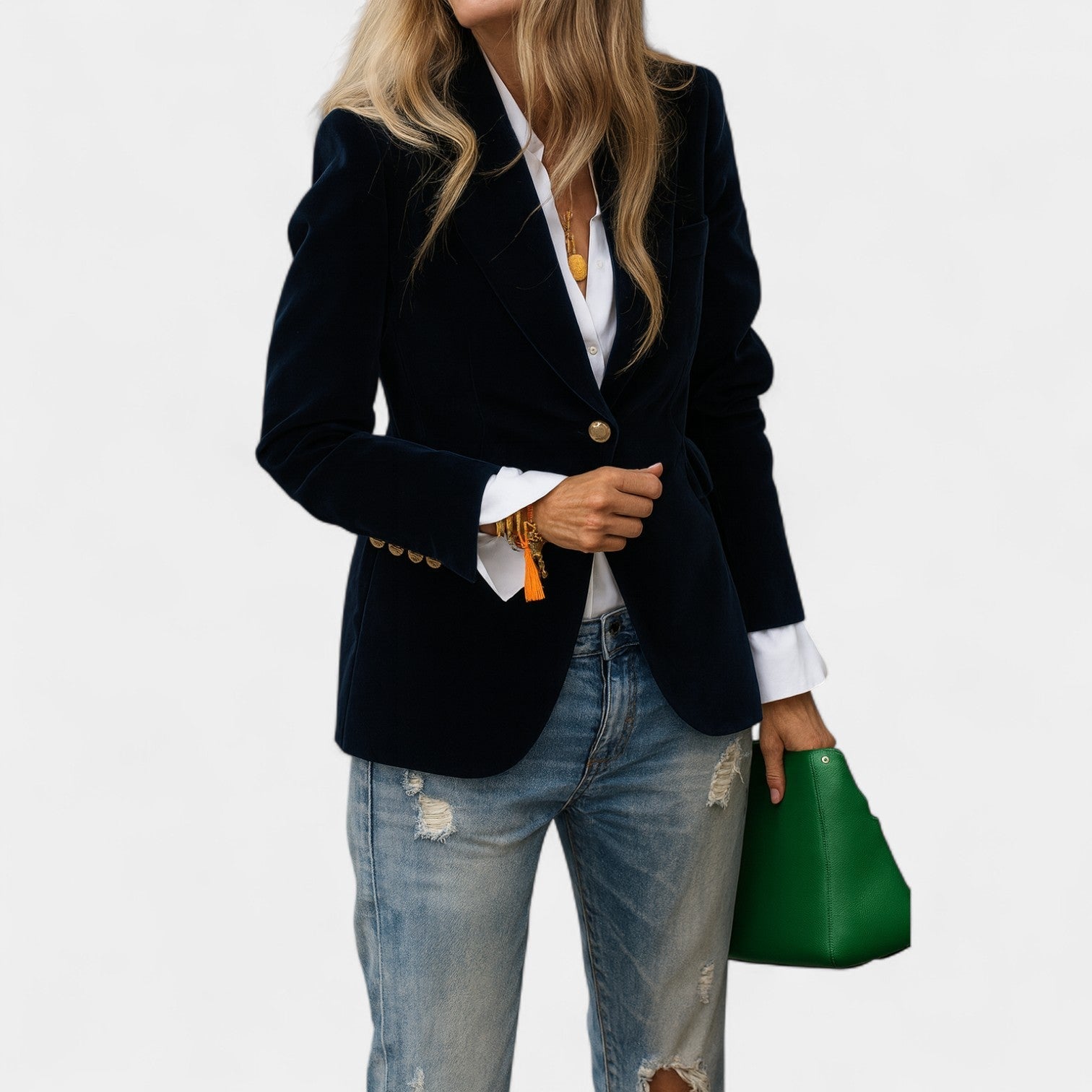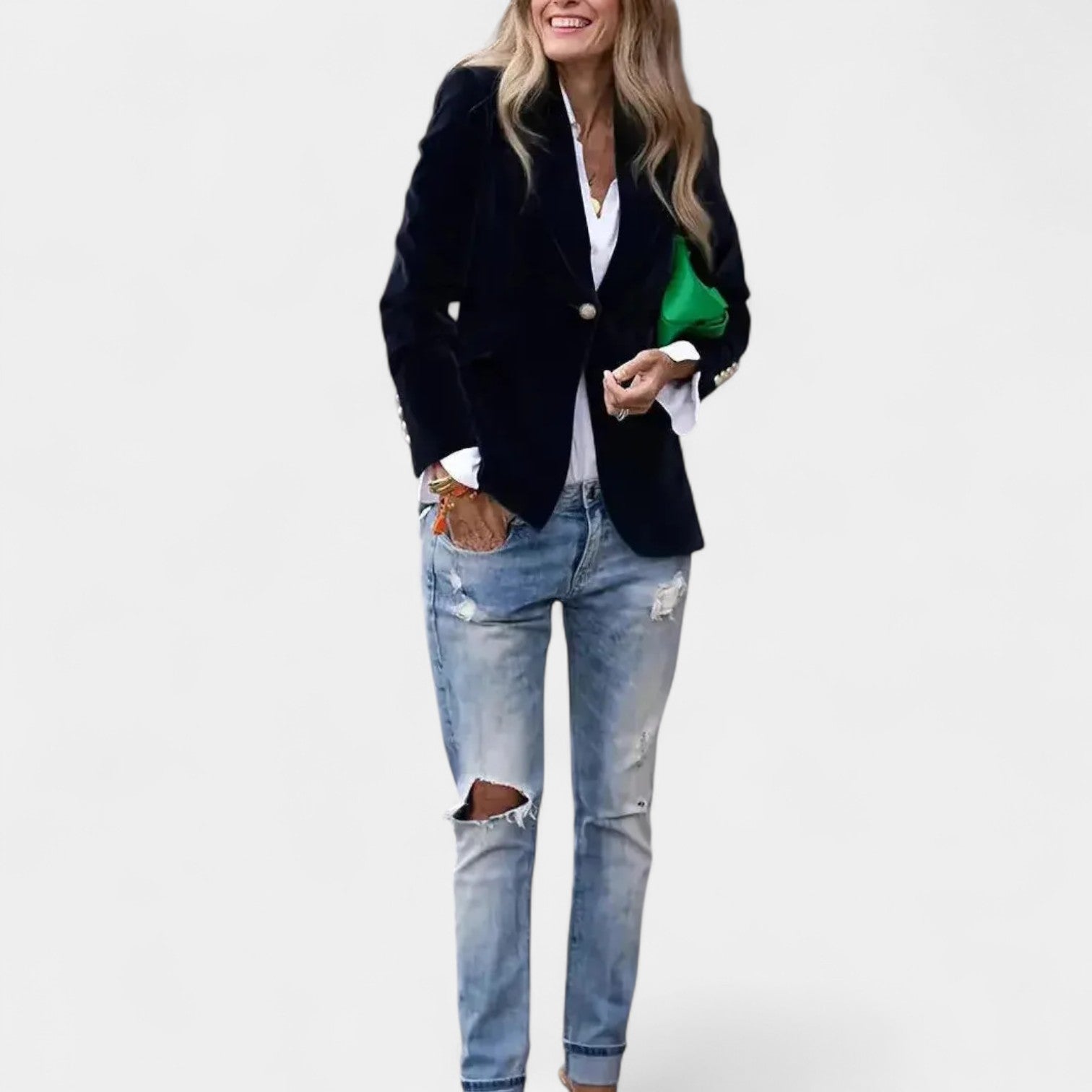 Sako Andrea s jemným sametovým povrchom je dokonalý kus pre ženy, ktoré chcú pôsobiť elegantne a sebavedome v každej situácii. Vďaka presnému strihu s jedným zapínaním, ostrými klopami a jemne vystuženými ramenami vytvára lichotivú siluetu, ktorá sa hodí k džínsom aj k elegantnejším šatám. Zlaté gombíky na rukávoch dodávajú celku sofistikovaný detail.
