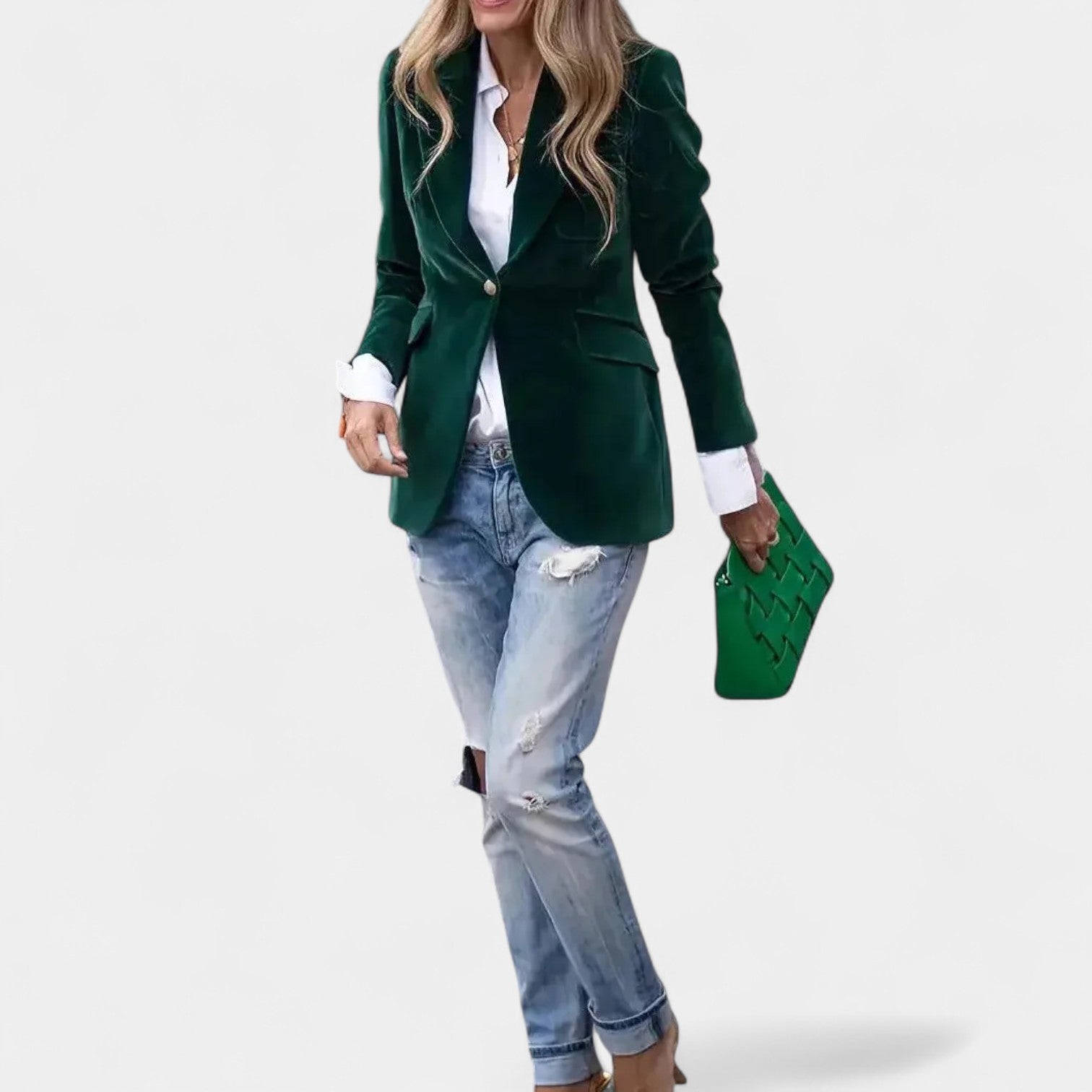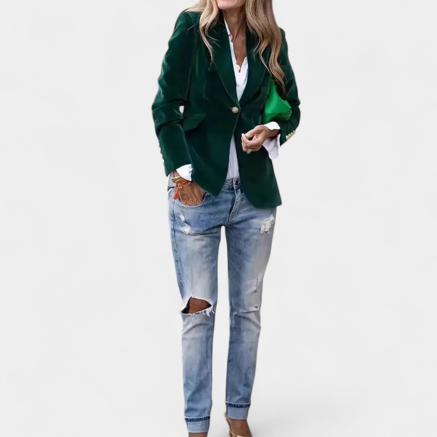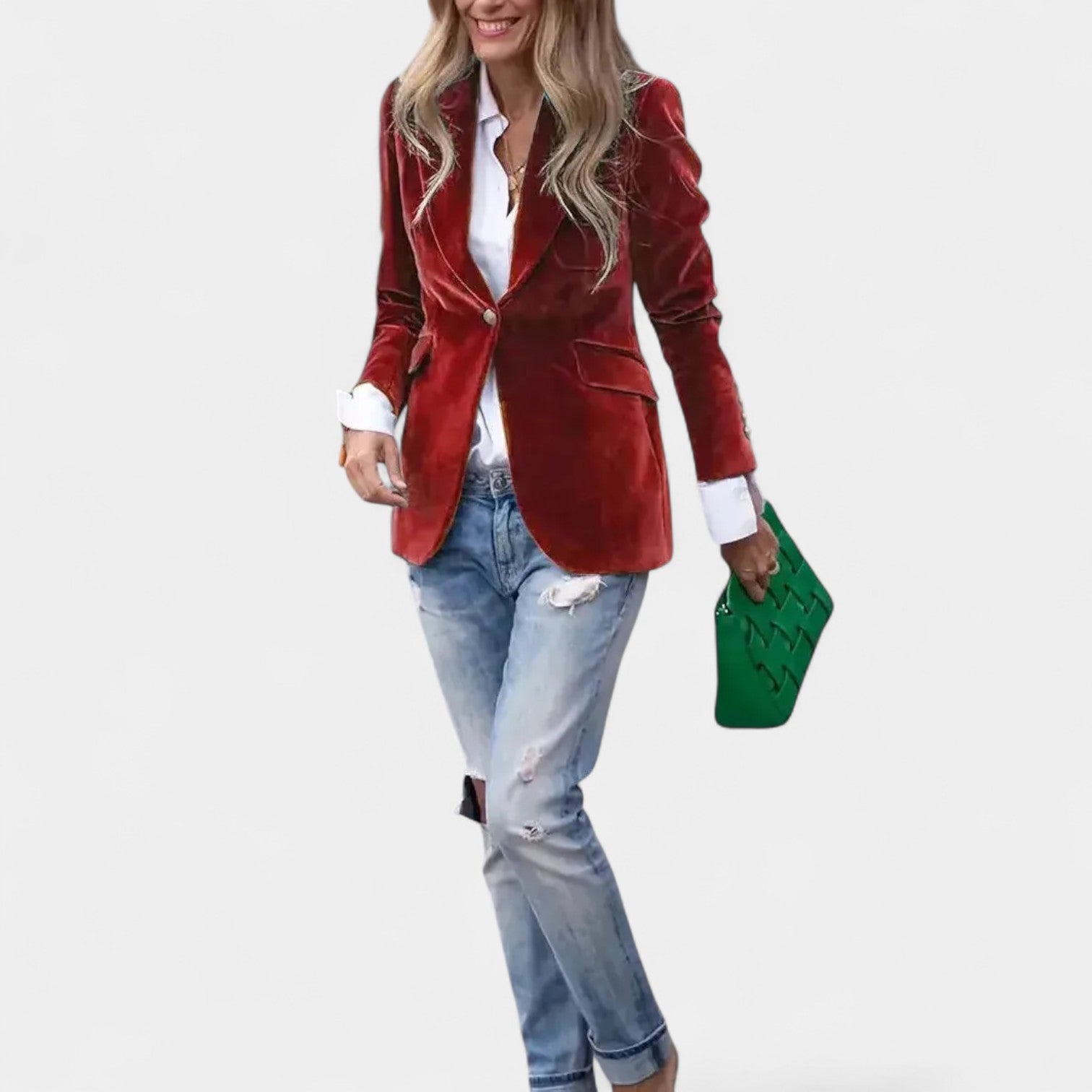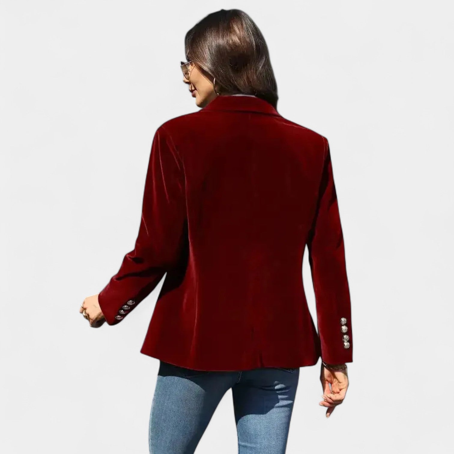 Sako Andrea s jemným sametovým povrchom je dokonalý kus pre ženy, ktoré chcú pôsobiť elegantne a sebavedome v každej situácii. Vďaka presnému strihu s jedným zapínaním, ostrými klopami a jemne vystuženými ramenami vytvára lichotivú siluetu, ktorá sa hodí k džínsom aj k elegantnejším šatám. Zlaté gombíky na rukávoch dodávajú celku sofistikovaný detail.