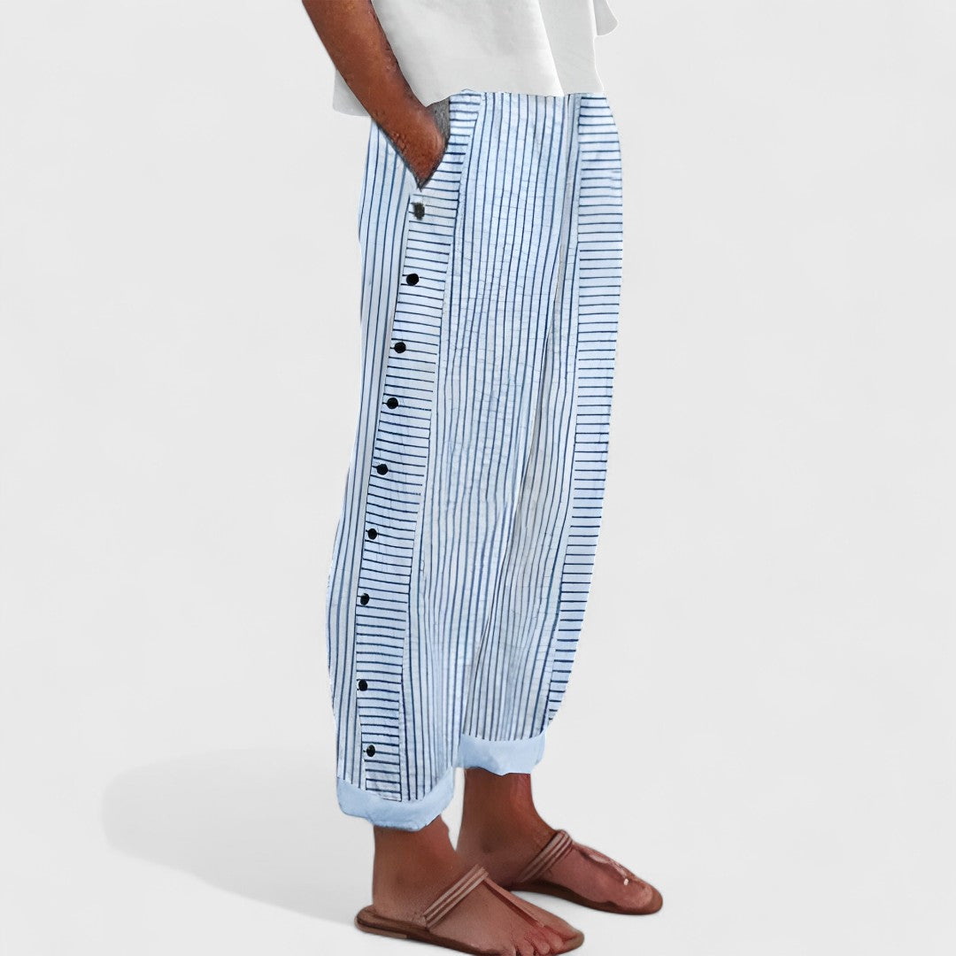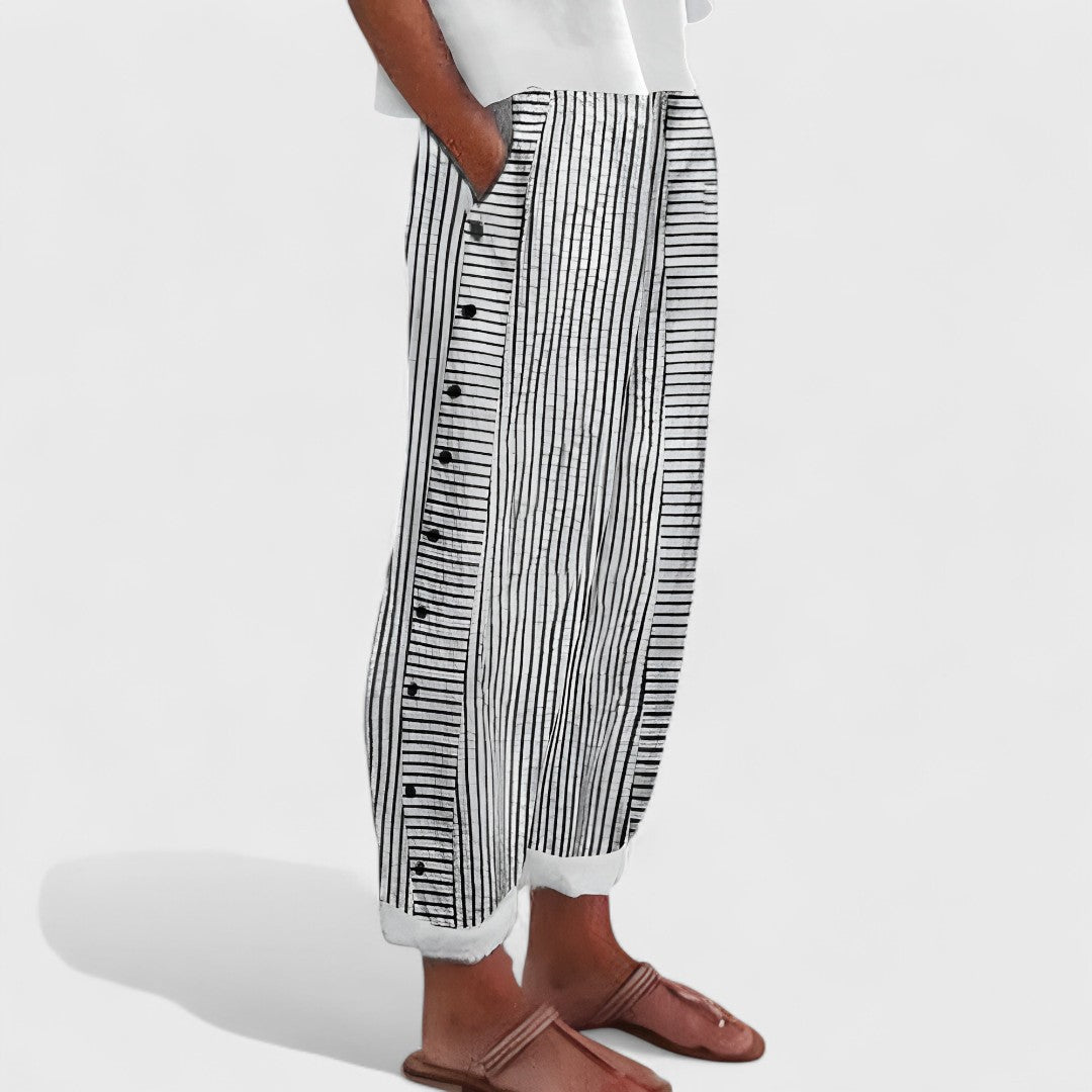 Nohavice Věra sú vyrobené z jemného ľanu, ktorý prirodzene chladí a dýcha. Vďaka voľnému strihu a elastickému pásu poskytujú pohodlie a zároveň vyzerajú upravene – ideálne na prechádzky, večerné stretnutia alebo dni, keď chcete vyzerať štýlovo a zároveň sa cítiť dobre.